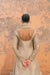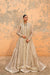 A metallic taupe shirt featuring intricate pastel embroidery, zardozi, and sequin details along each side. The shirt is finished with gotta work at the hem and center, combining gotta and mirror embellishments to create the illusion of a front-open design. The matching dupatta, crafted from zari net fabric, is adorned with heavily embellished borders, featuring with inner scalloped edges and kiran finishing. The look is completed with a large flared gharara.